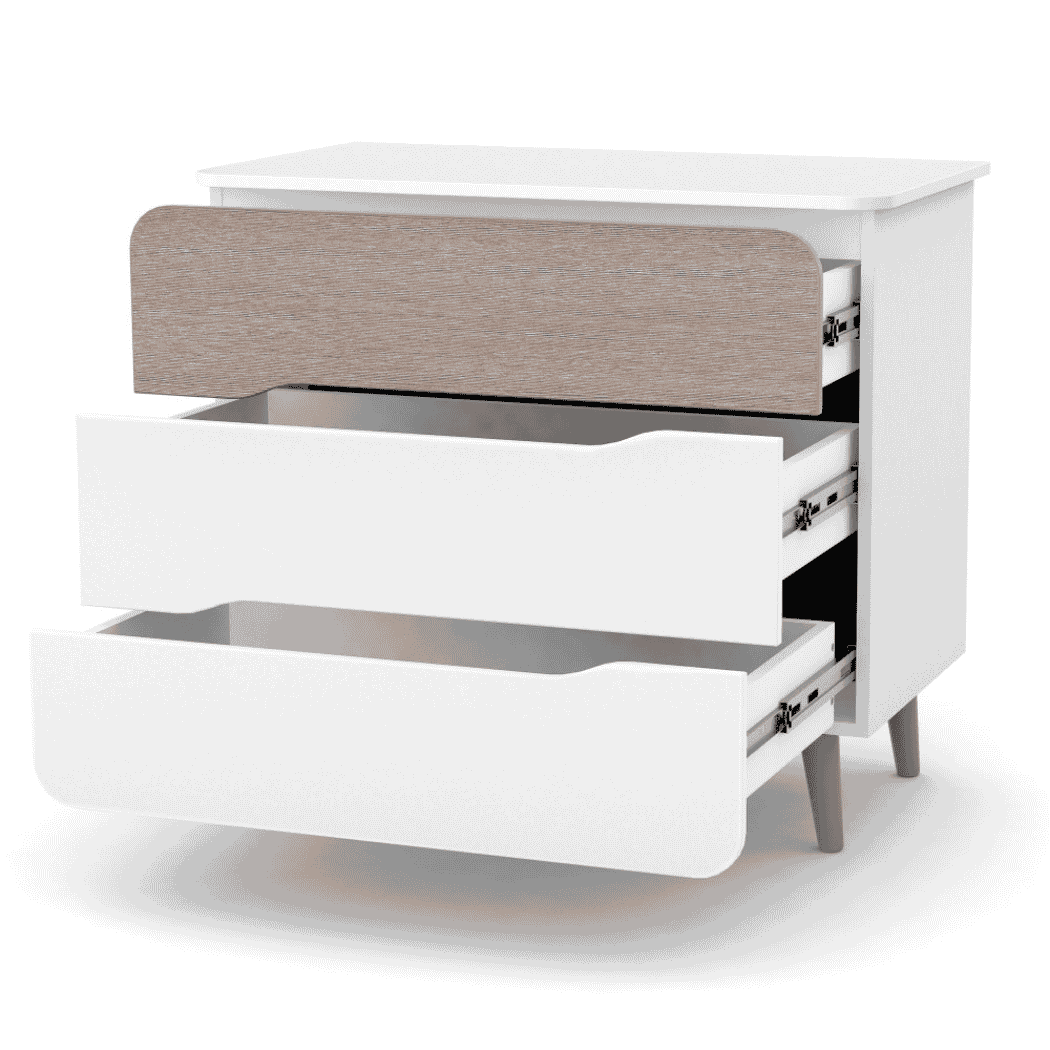 Když je vaše dítě malé, je velmi důležité, aby mělo vše po ruce. Dětská komoda Belitto o šířce 90 cm má tři výsuvné zásuvky. Teleskopické vedení s plným výsuvem, vysokou nosností a ochranou proti úplnému vyjmutí. Miminko můžete přebalit, aniž byste ho opustili, stačí zásuvku otevřít a vyndat vše potřebné.