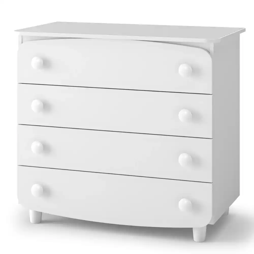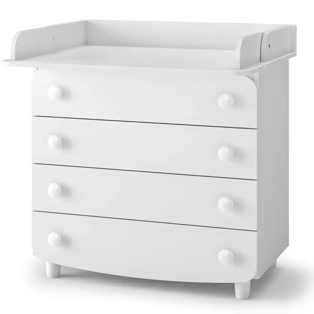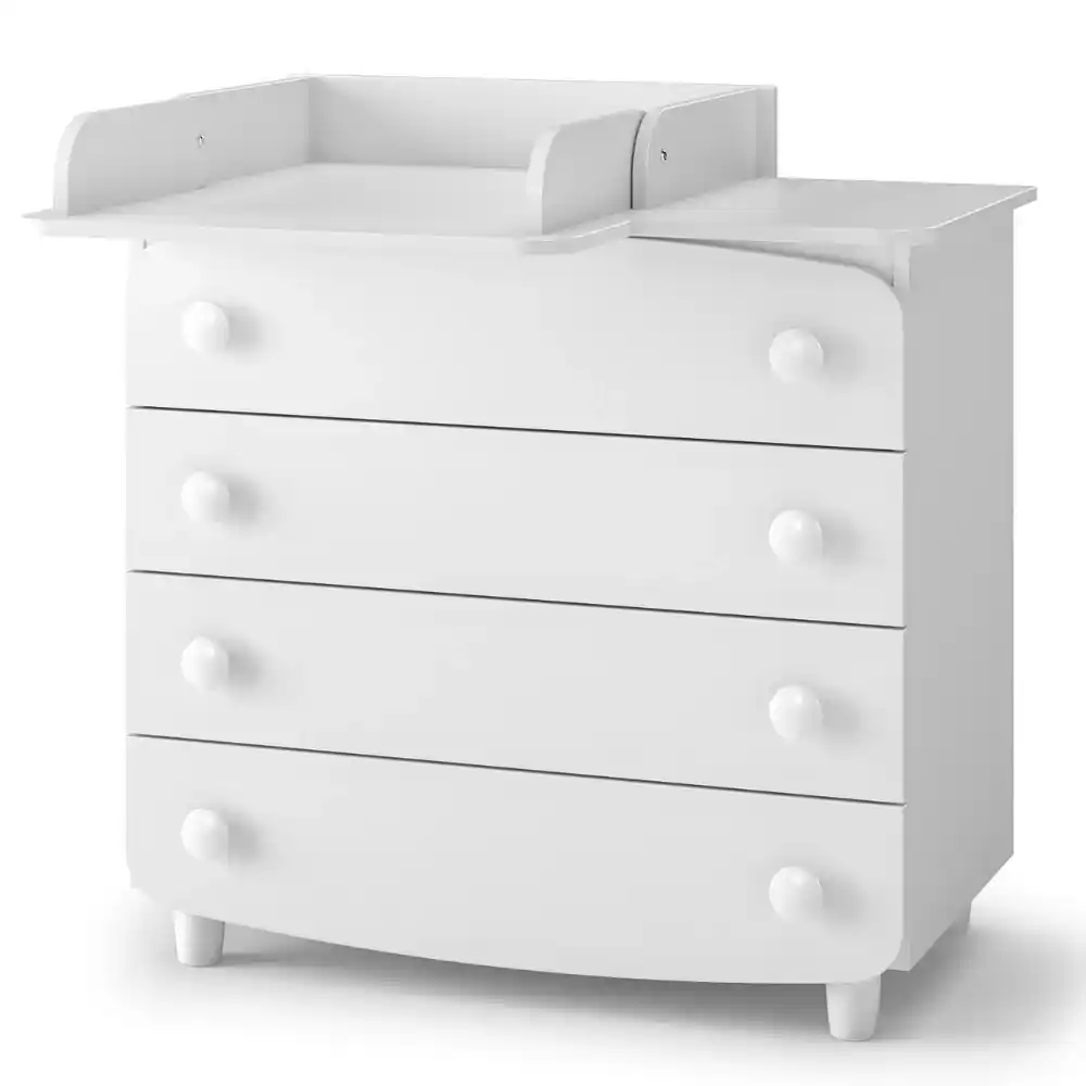 Teleskopické plně výsuvné pojezdy s vysokou nosností a pojistkou proti úplnému vysunutí možnost instalace úzkého nebo širokého přebalovacího stolku (stacionárního nebo skládacího), vpravo nebo vlevo. Přebalovací stolek lze kdykoli rozebrat a komodu lze použít jako běžný nábytek. Součástí balení je bezpečnostní popruh pro upevnění ke stěně.