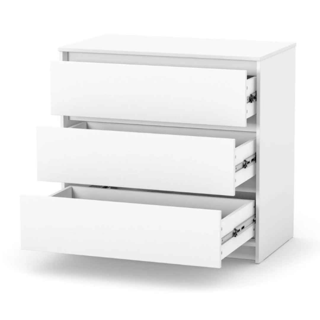 Teleskopické plně výsuvné pojezdy s vysokou nosností a pojistkou proti úplnému vysunutí možnost instalace úzkého nebo širokého přebalovacího stolku (stacionárního nebo skládacího), vpravo nebo vlevo. Přebalovací stolek lze kdykoli rozebrat a komodu lze použít jako běžný nábytek. Součástí balení je bezpečnostní popruh pro upevnění ke stěně.
