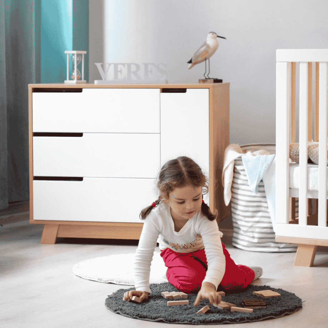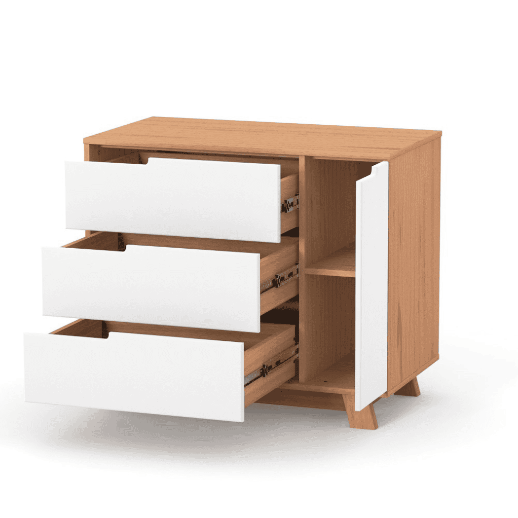 Když je dítě malé, je velmi důležité, aby bylo vše po ruce. Dětská komoda Lussi o šířce 90 cm má tři výsuvné zásuvky a dvě police za dvířky. Teleskopické kolejnice s plným výsuvem, vysokou nosností a ochranou proti úplnému vysunutí. Můžete dítě převlékat, aniž byste od něj odcházeli, stačí otevřít zásuvku a vzít vše potřebné.