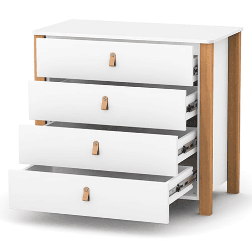 Dětská komoda Zukko o šířce 90 cm má čtyři výsuvné zásuvky. Teleskopické vodicí lišty s plným výsuvem, vysokou nosností a ochranou proti úplnému vysunutí. Když je dítě malé, je velmi důležité, aby bylo vše po ruce. Můžete dítě přebalit, aniž byste ho opustili, stačí otevřít zásuvku a vzít si vše, co potřebujete.