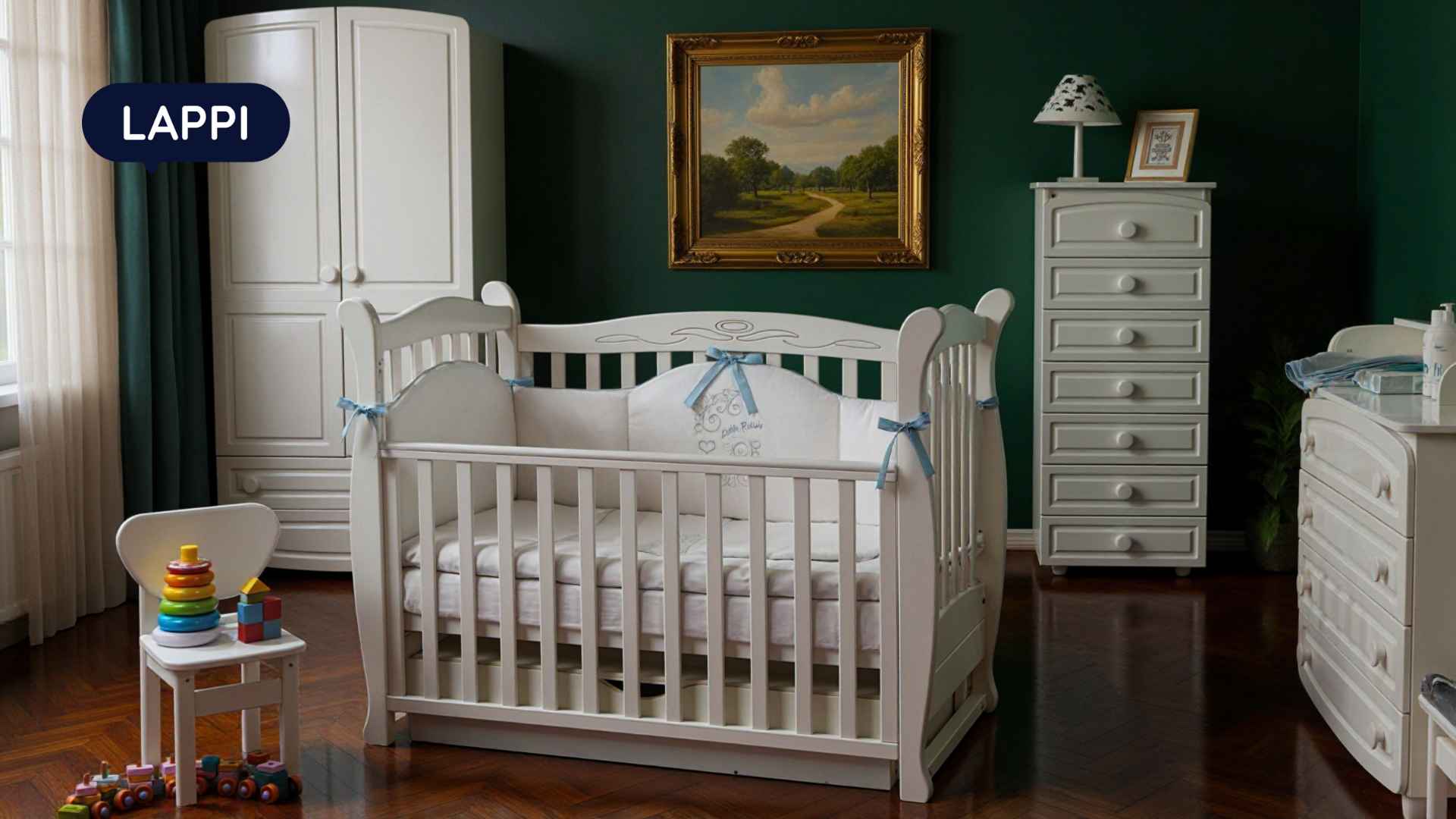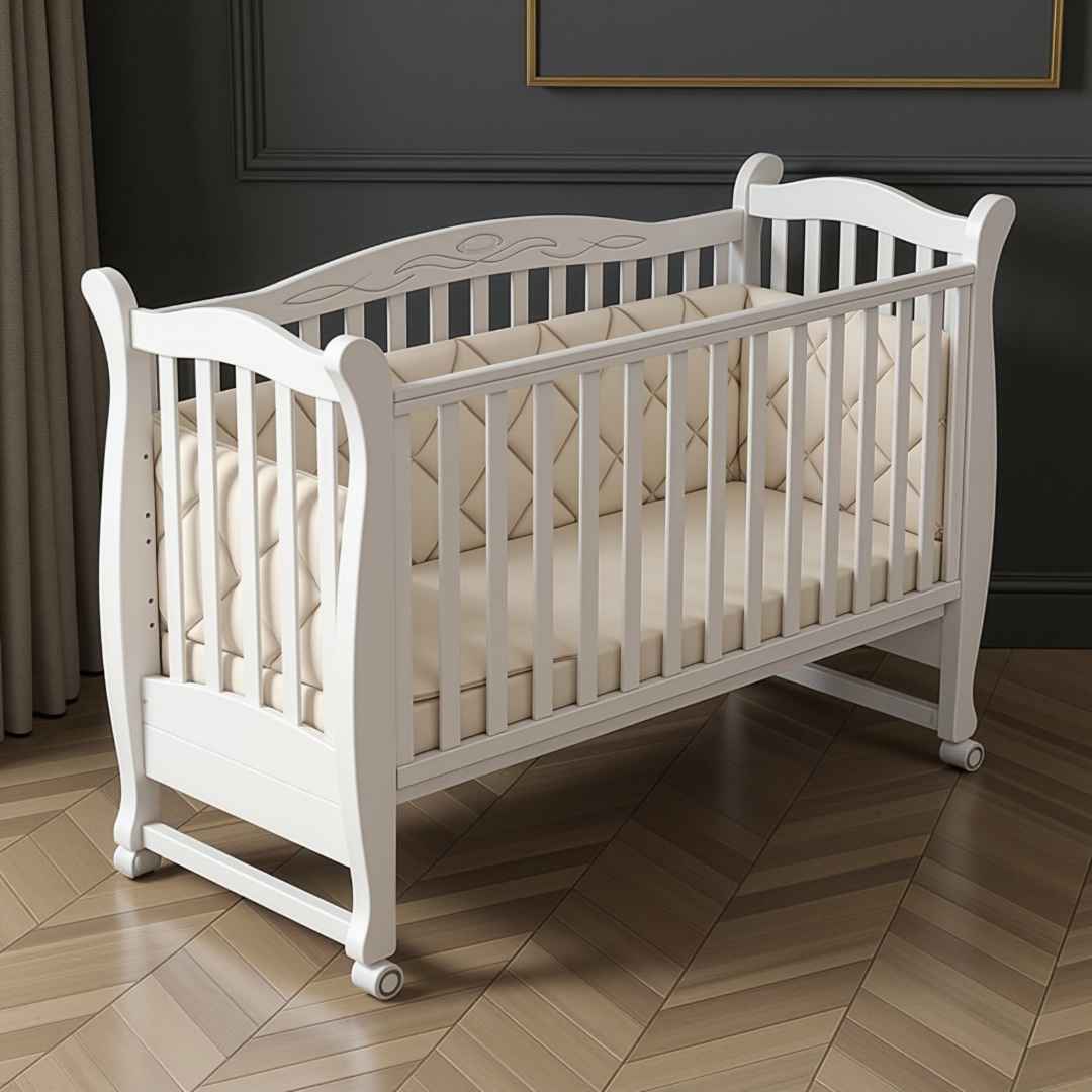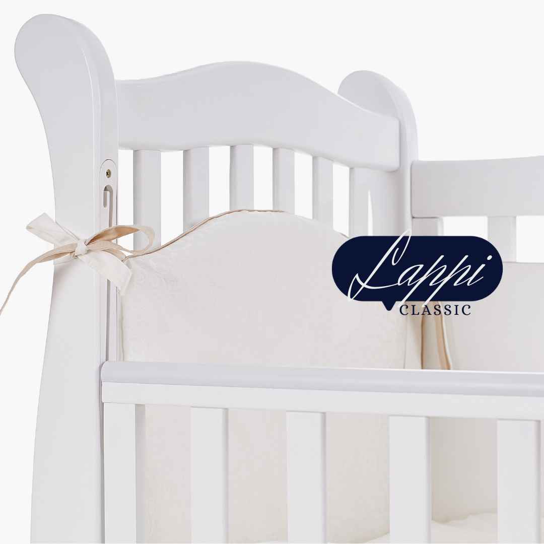 Dětská postýlka Lappi – to je krásná postýlka s klasickým designem, s jemně tvarovanými dřevěnými detaily a vzorem na zadní bočnici.