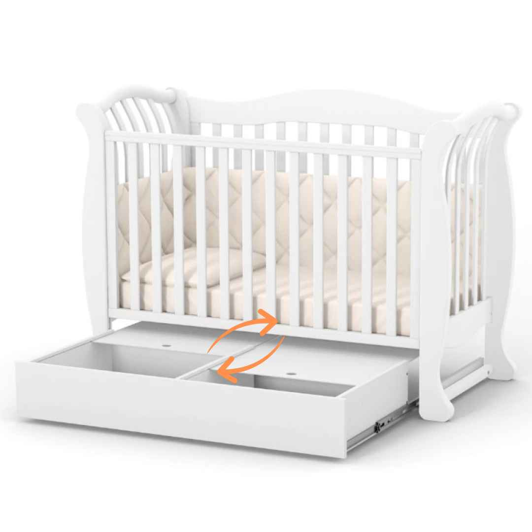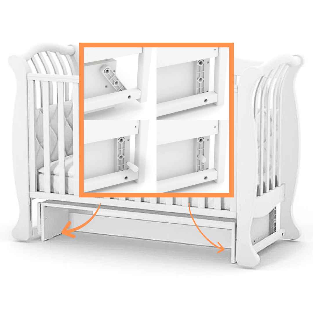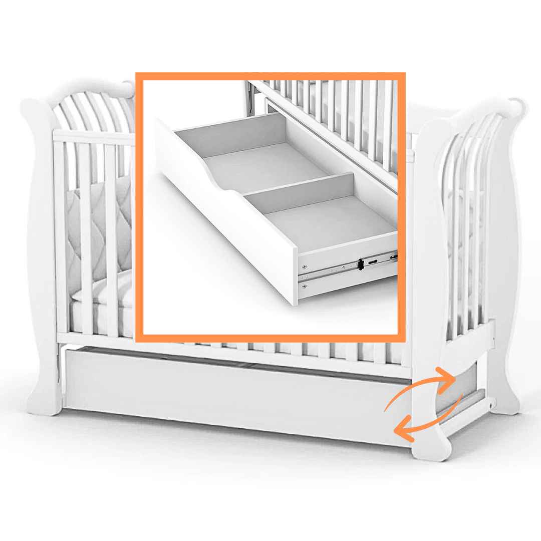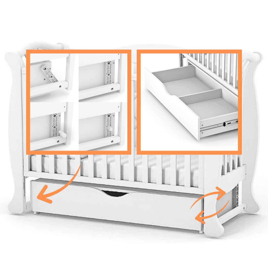 Houpací mechanismus s aretací pro uklidnění dítěte. Se zásuvkou na uložení věcí – zásuvka je uzavřená, rozdělena na 2 sekce a umístěná na podlaze (není zavěšená na postýlce). Kvalitní teleskopické pojezdy od německé značky Hafele;