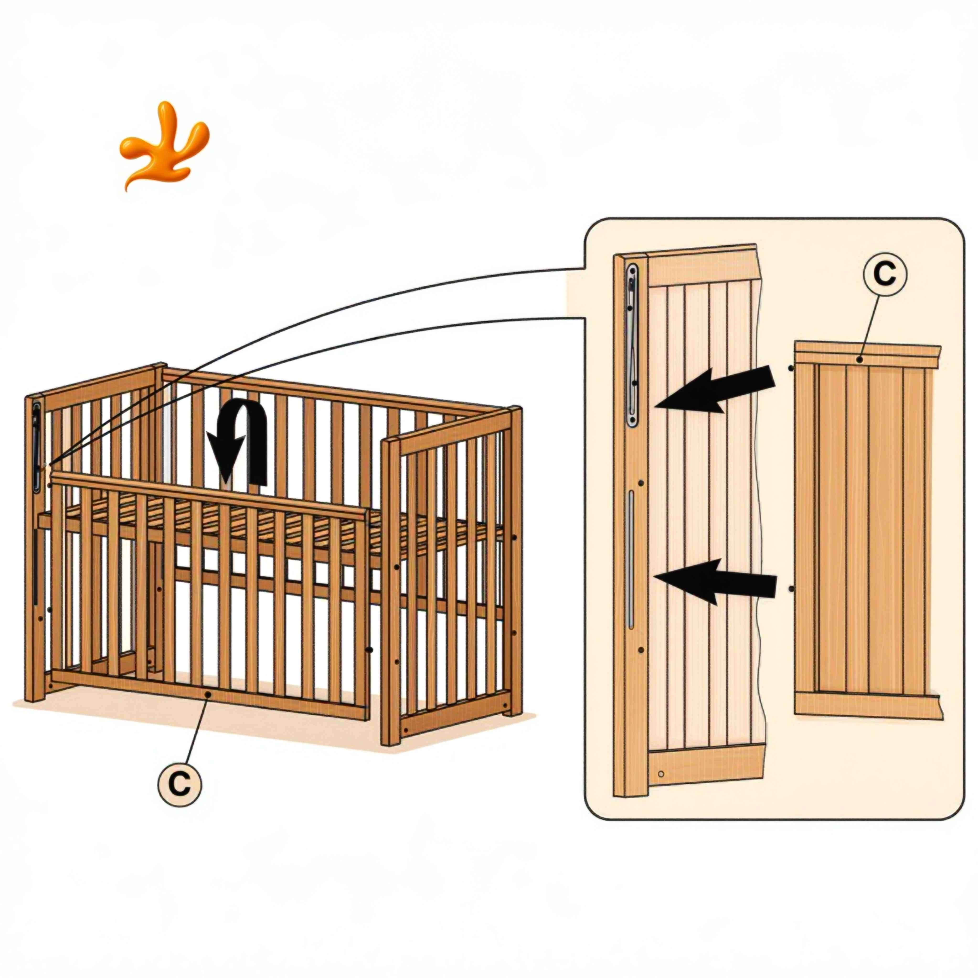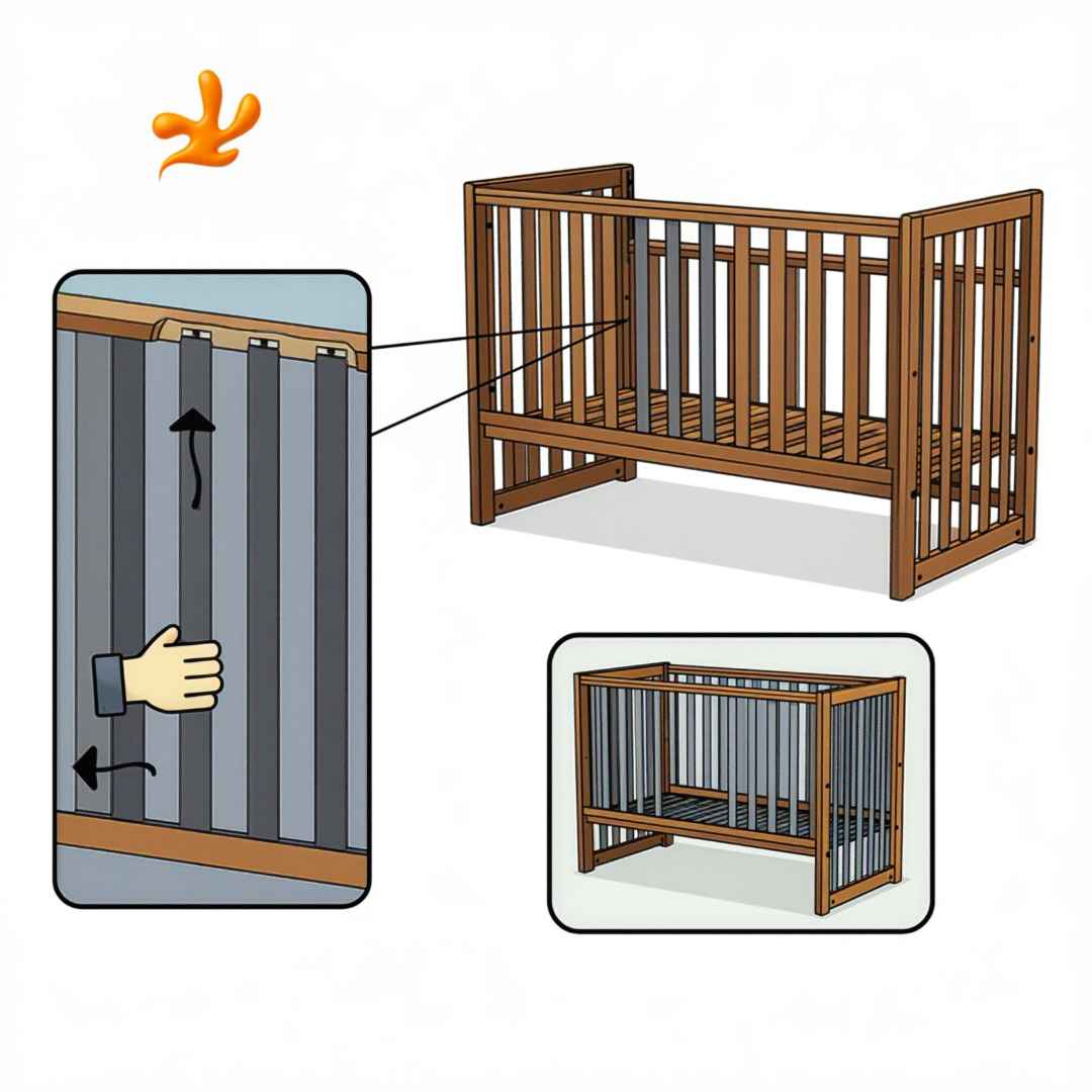 Když dítě trochu povyroste, můžete odstranit tři prostřední příčky a vytvořit tak bezpečný vchod, kterým dítě může samostatně vylézat a zalézat do postýlky. Bezpečné příčky jsou navrženy tak, aby je rodiče mohli snadno vyjmout, ale dítě ne.