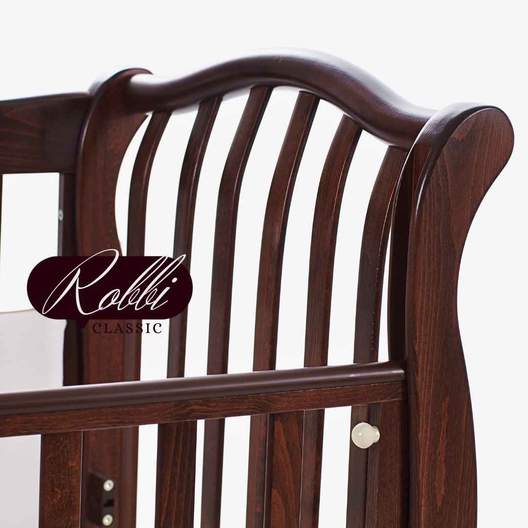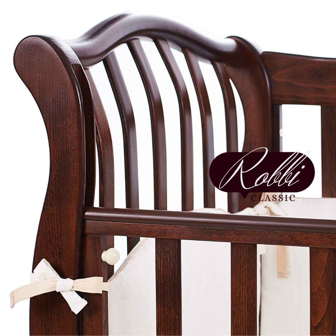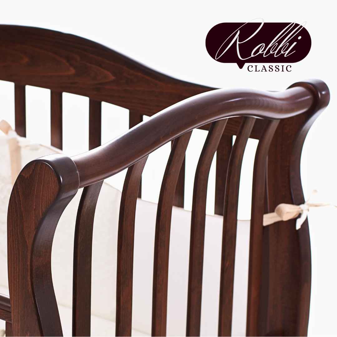 Dětská postýlka Robbi – to je krásná postýlka s klasickým designem, s jemně tvarovanými dřevěnými detaily a vzorem na zadní bočnici.