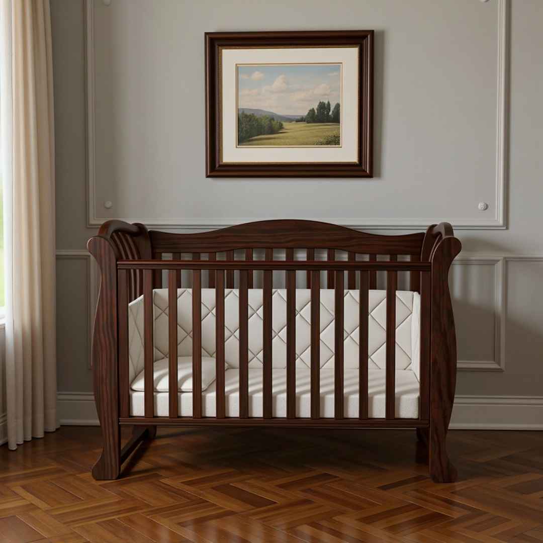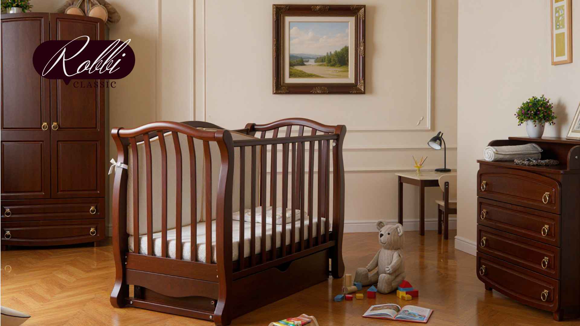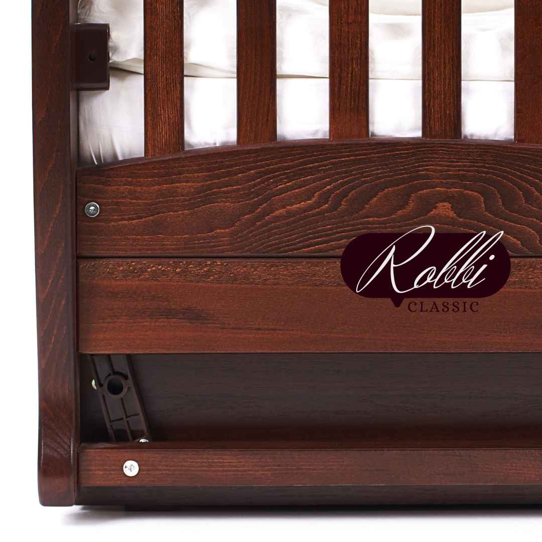 Dětská postýlka Robbi – to je krásná postýlka s klasickým designem, s jemně tvarovanými dřevěnými detaily a vzorem na zadní bočnici.