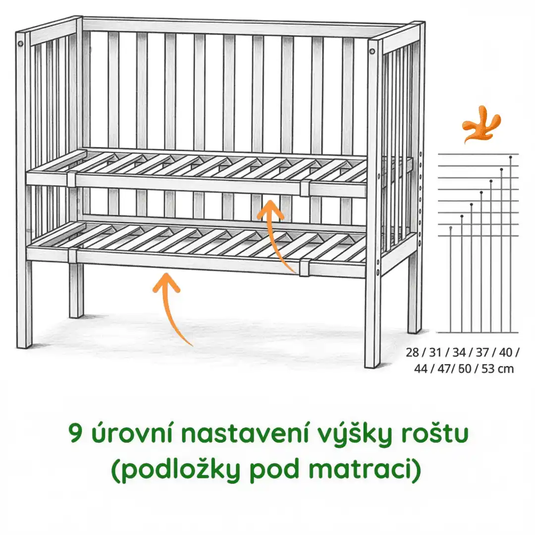 Bez houpacího mechanismu se postýlka instaluje na nožky. 9 úrovně nastavení roštu: 28 / 31 / 34 / 37 / 40 / 44 / 47/ 50 / 53 cm.