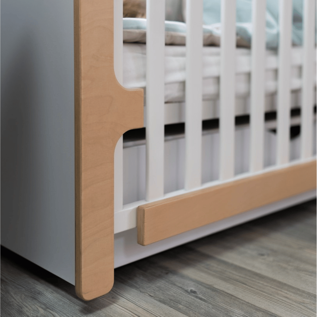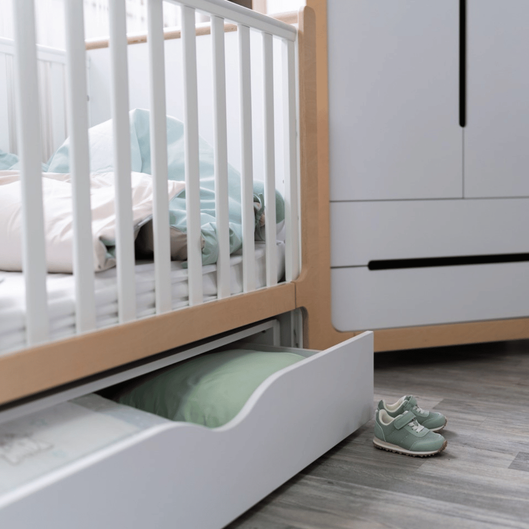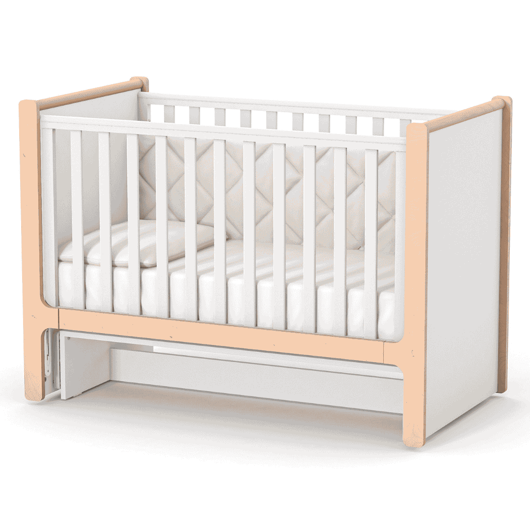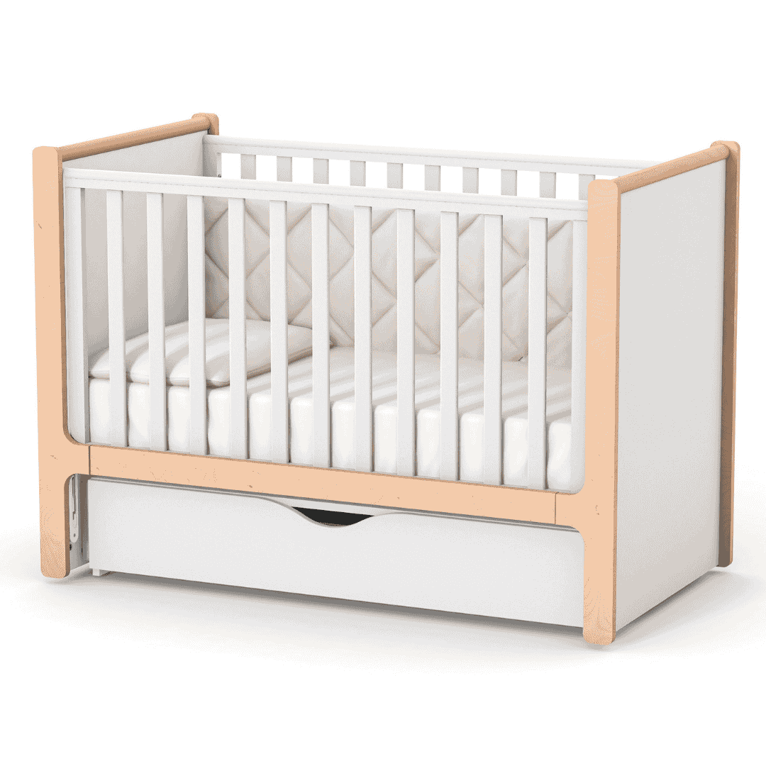 Houpací mechanismus s aretací pro uklidnění dítěte. Se zásuvkou na uložení věcí – zásuvka je uzavřená, rozdělena na 2 sekce a umístěná na podlaze (není zavěšená na postýlce). Kvalitní teleskopické pojezdy od německé značky Hafele;