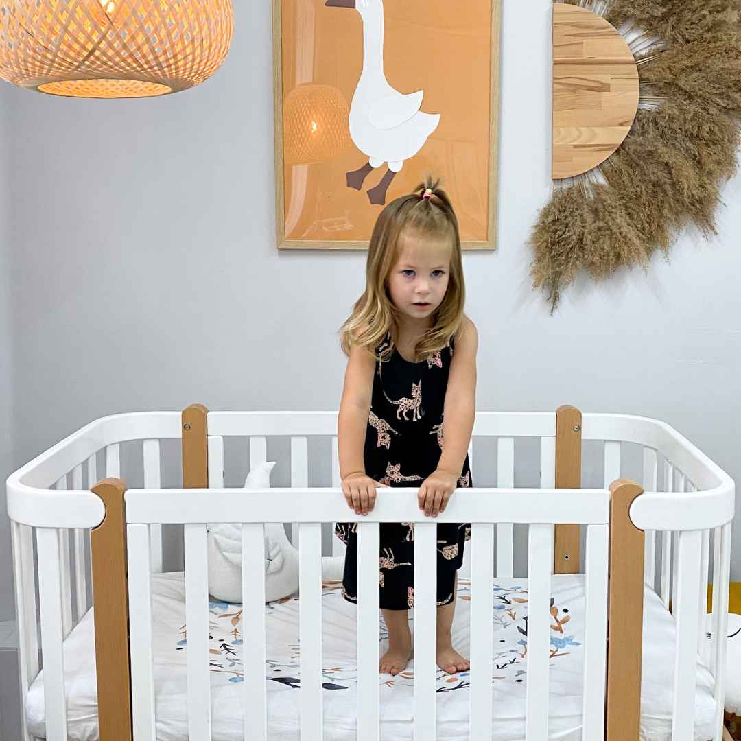 Když dítě trochu povyroste, můžete odstranit tři prostřední příčky a vytvořit tak bezpečný vchod, kterým dítě může samostatně vylézat a zalézat do postýlky. Bezpečné příčky jsou navrženy tak, aby je rodiče mohli snadno vyjmout, ale dítě ne.