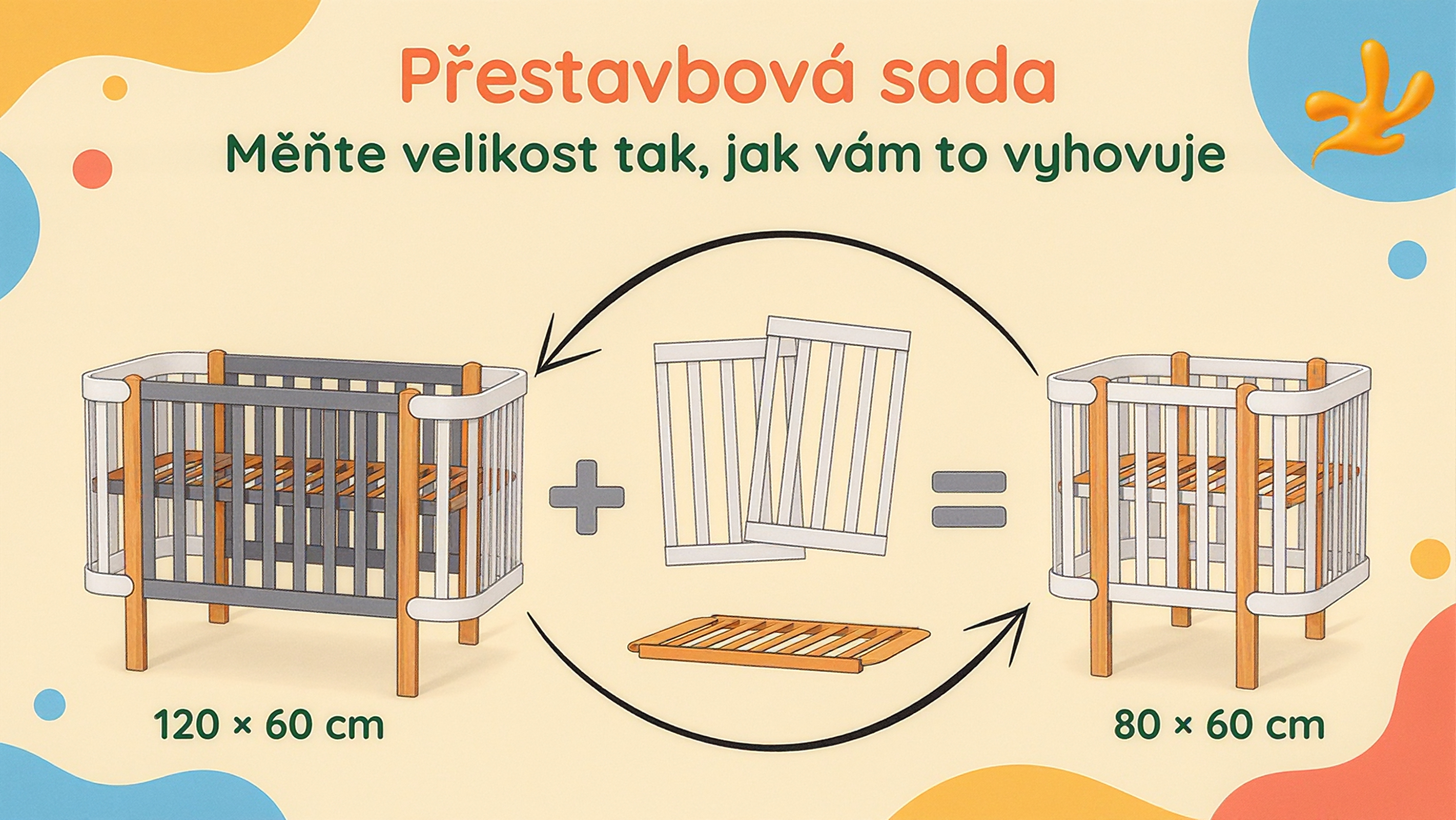 Tato sada je doplňkovou možností, která vám umožní proměnit standardní postýlku o rozměrech 120 × 60 cm na menší postýlku o rozměrech 80 × 60 cm. Jakmile dítě trochu vyroste, můžete svou mini postýlku jednoduše přeměnit zpět na větší postýlku.