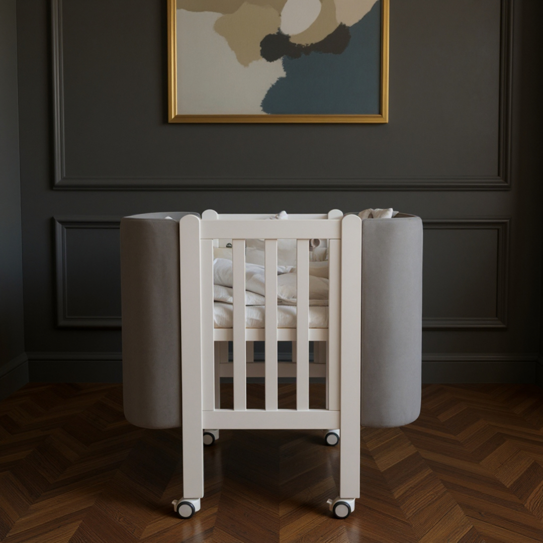 Mini postýlka byla vytvořena s důrazem na komfort a bezpečí. Stylové a funkční řešení pro novorozence – zaoblené tvary, leštěné povrchy, lamelový rošt pro dobrou ventilaci matrace a ložního prádla. Vyrobeno z přírodního buku a ošetřeno vodou ředitelnými antibakteriálními barvami a laky ze Švédska. Kování značky Hafele (Německo).